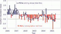 Monthly values of the Southern Oscillation Index (SOI), a measure of the changes in atmospheric pressures across the Pacific, and the threemonth mean (black line).