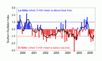 Monthly values of the Southern Oscillation Index (SOI), a measure of the changes in atmospheric pressures across the Pacific, and the three-month mean (black line). The SOI weakened during November to a three month (September to November) average of -0.9.
