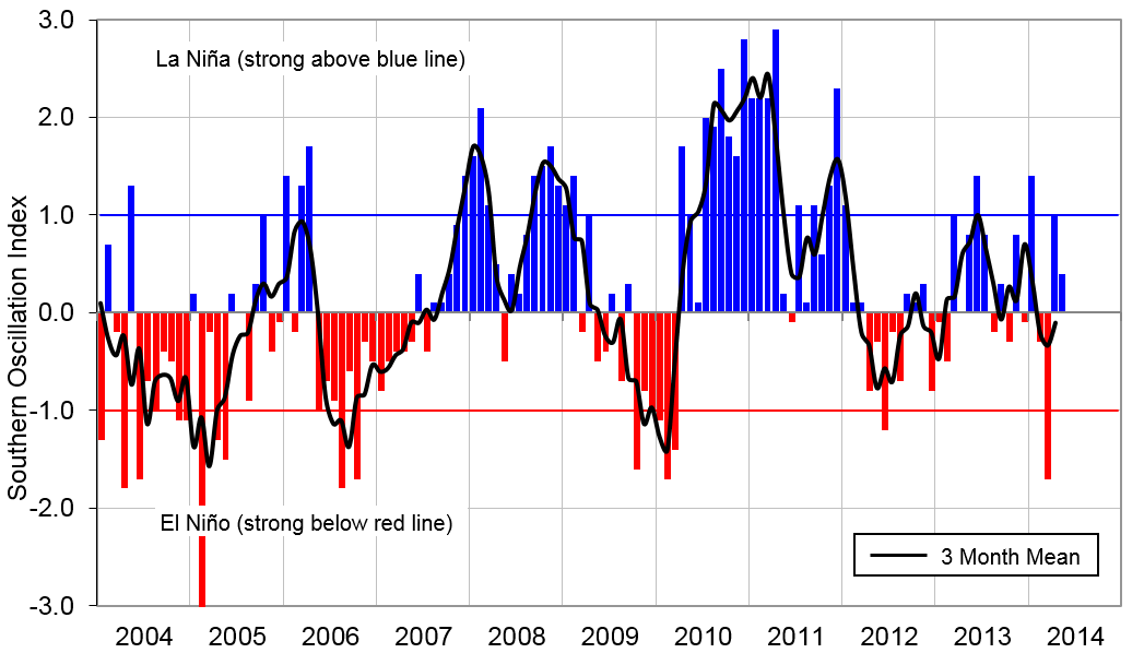 Monthly values of the Southern Oscillation Index (SOI), a measure of changes in atmospheric pressures across the Pacific, and the 3-month mean (black line). SOI mean values: May SOI +0.4; March to May average -0.1.