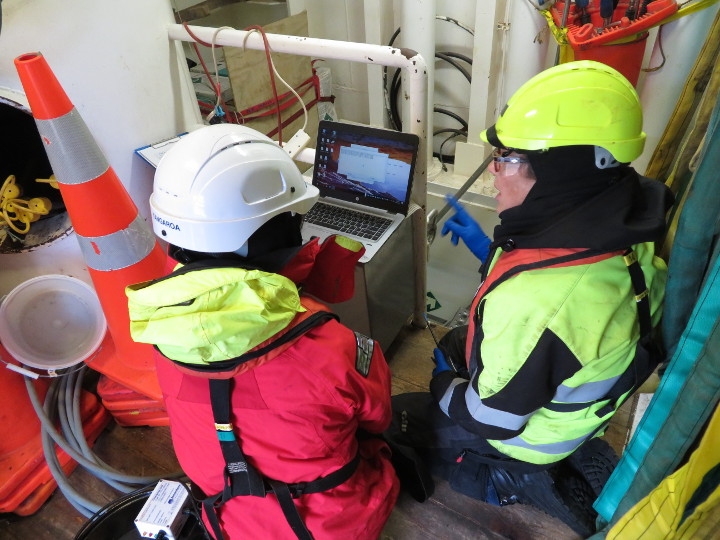 NIWA mooring technicians Olivia Price (L) and Sarah Searson (R) prepare to release a mooring. [Photo: Richard O’Driscoll, NIWA)