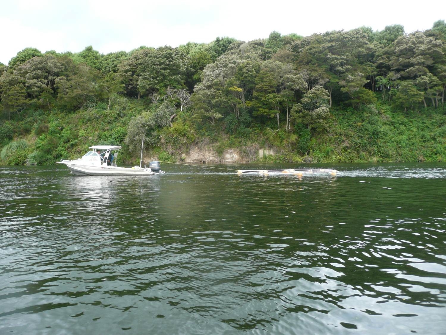Towing a frame behind the boat to the study site. Credit: Deborah Hofstra