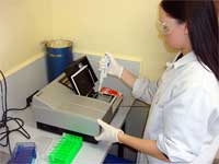 MSc student Aimee Gibson measuring stress enzymes on a microplate reader. (Photo: Michael Ahrens, NIWA)