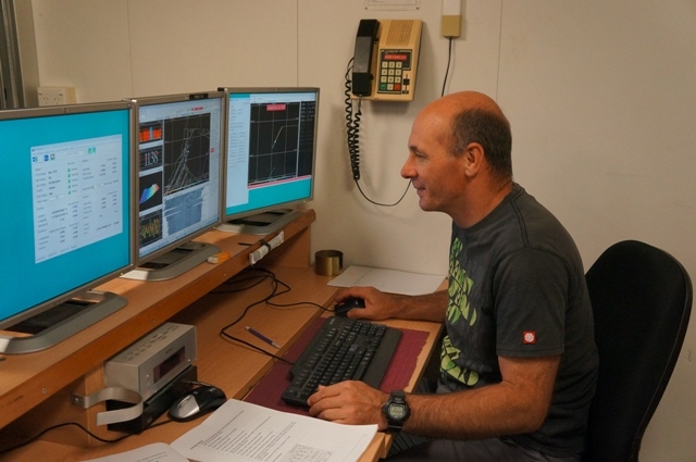 NIWA marine ecology technician Mark Fenwick in the multibeam lab, running the system.