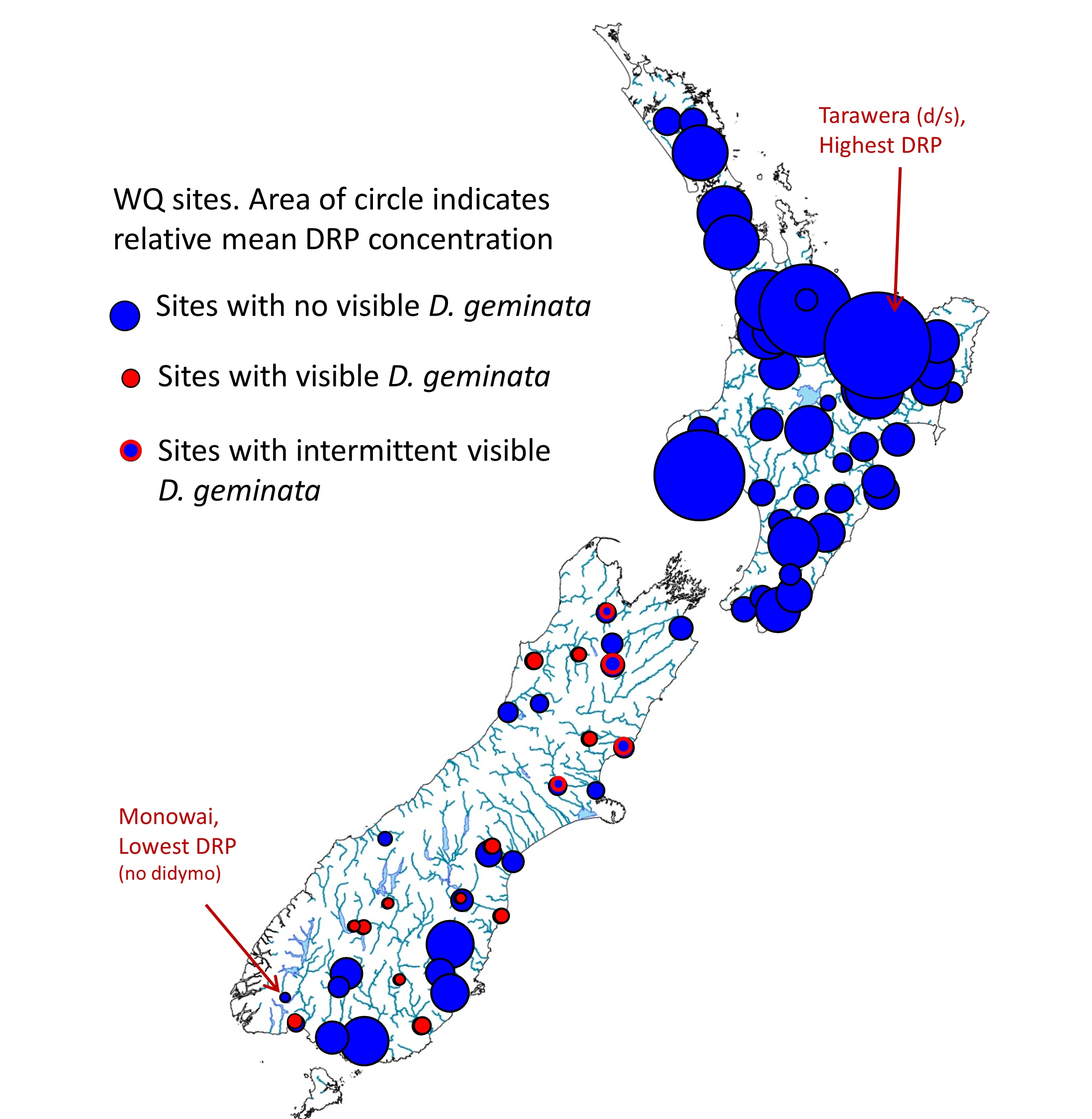 Locations of all 77 sites in the National River Water Quality Monitoring Network. Relative concentration of dissolved reactive phosphorus (DRP, average of monthly data, 2005 to 2011) is shown by the size of the circles. Red circles in the South Island indicate sites where didymo blooms are present, and all have average DRP ~2 ppb. Sites marked with blue circles have no didymo blooms. Visible didymo has been observed occasionally at sites with red and blue circles. Highest mean DRP (Tarawera) is 67.7 ppb, and lowest (Monowai) is 0.6 ppb.