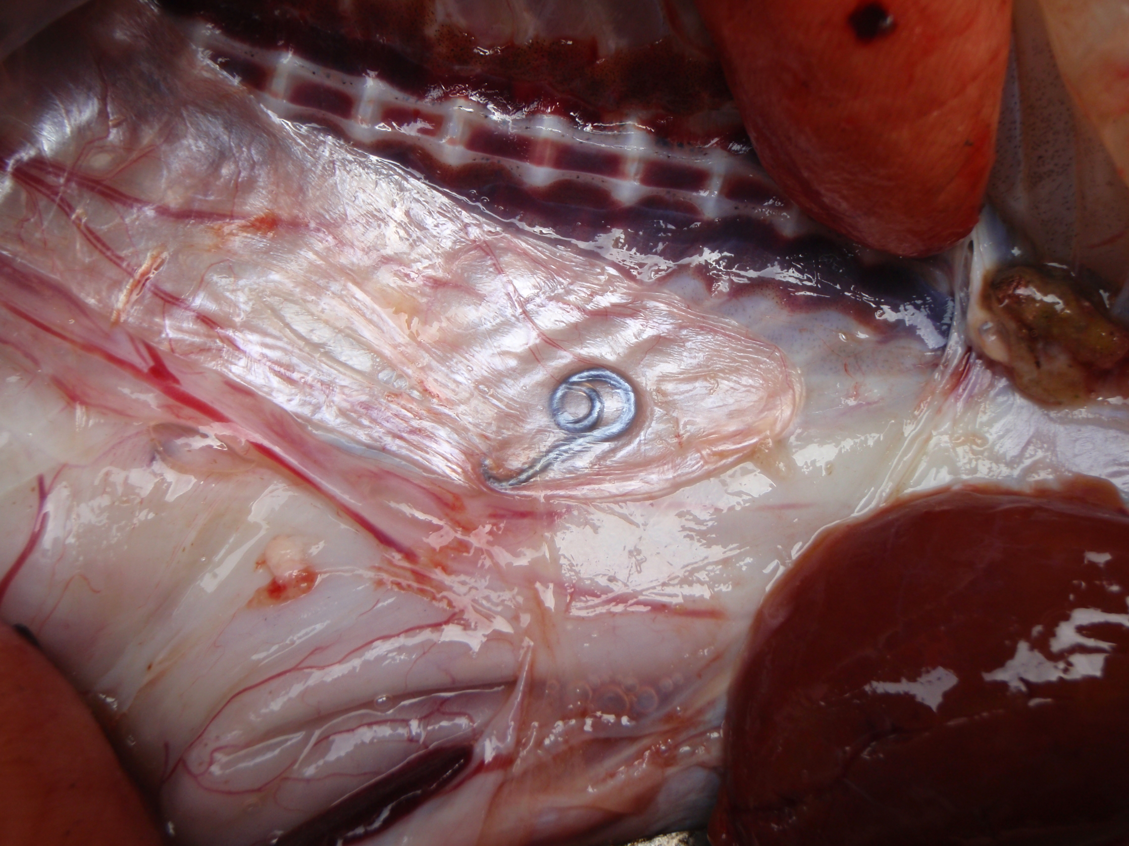A nematode worm in the swim bladder (note the swim bladder is deflated) of a shortfin eel from the Kaikou River. The swim bladder is an important organ as it helps fish to control their buoyancy. These parasites can disrupt eel migration by damaging their ability to dive to deeper depths during their ocean journey. Credit: NIWA