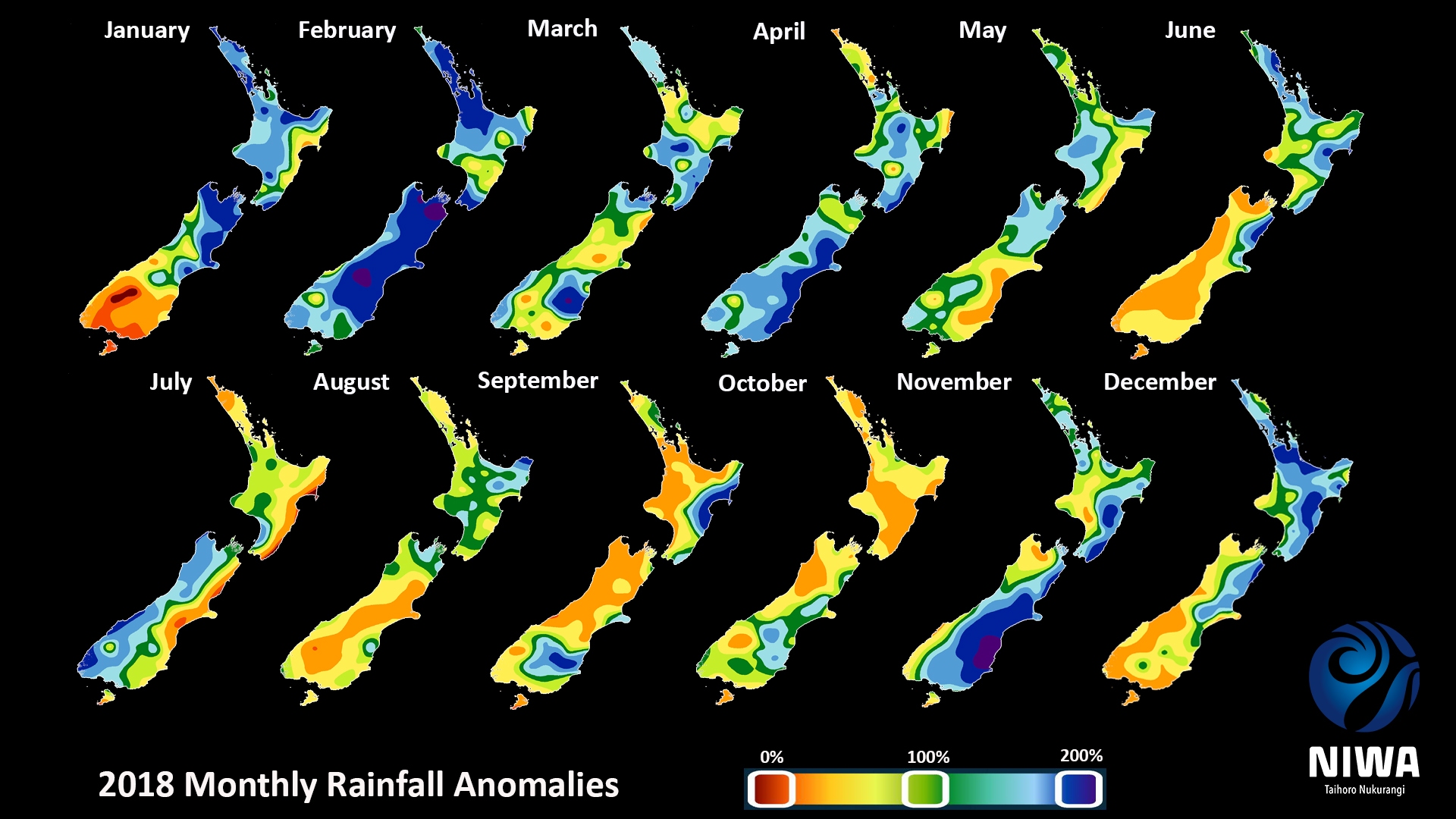 New Zealand 2018 monthly rainfall anomalies