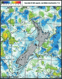 The New Zealand average sea surface temperature anomaly was about +0.5 °C in July, with the 3-month mean anomaly for May to July at about +0.6 °C.