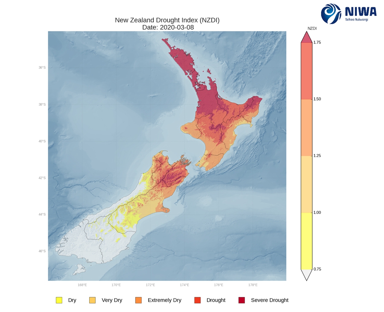 New Zealand Drought Index map 8 March 2020