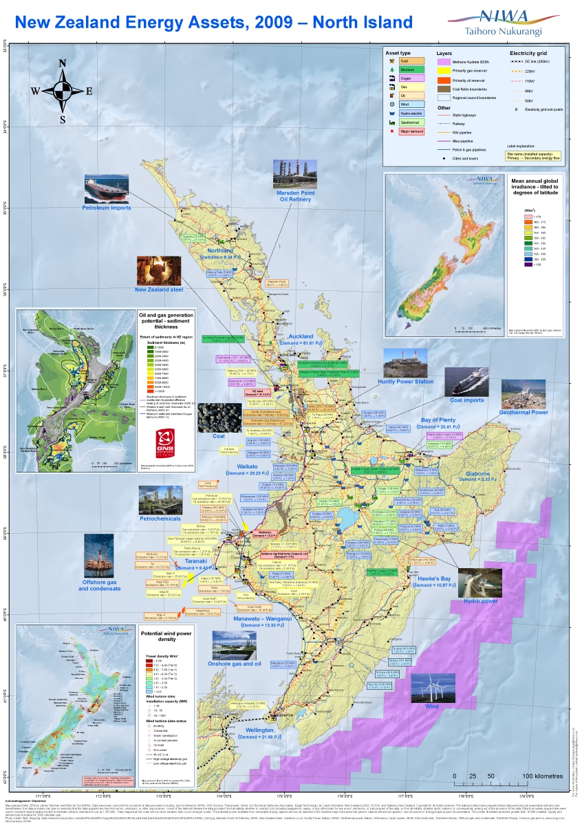 This ‘EnergyScape’ poster depicts the locations and capacities of New Zealand’s key energy assets in the North Island. It includes details of major power generators, energy flows from generators to key consumers, regional power consumption data, and power distribution networks. It also includes insert maps showing our nation’s energy generation potential.