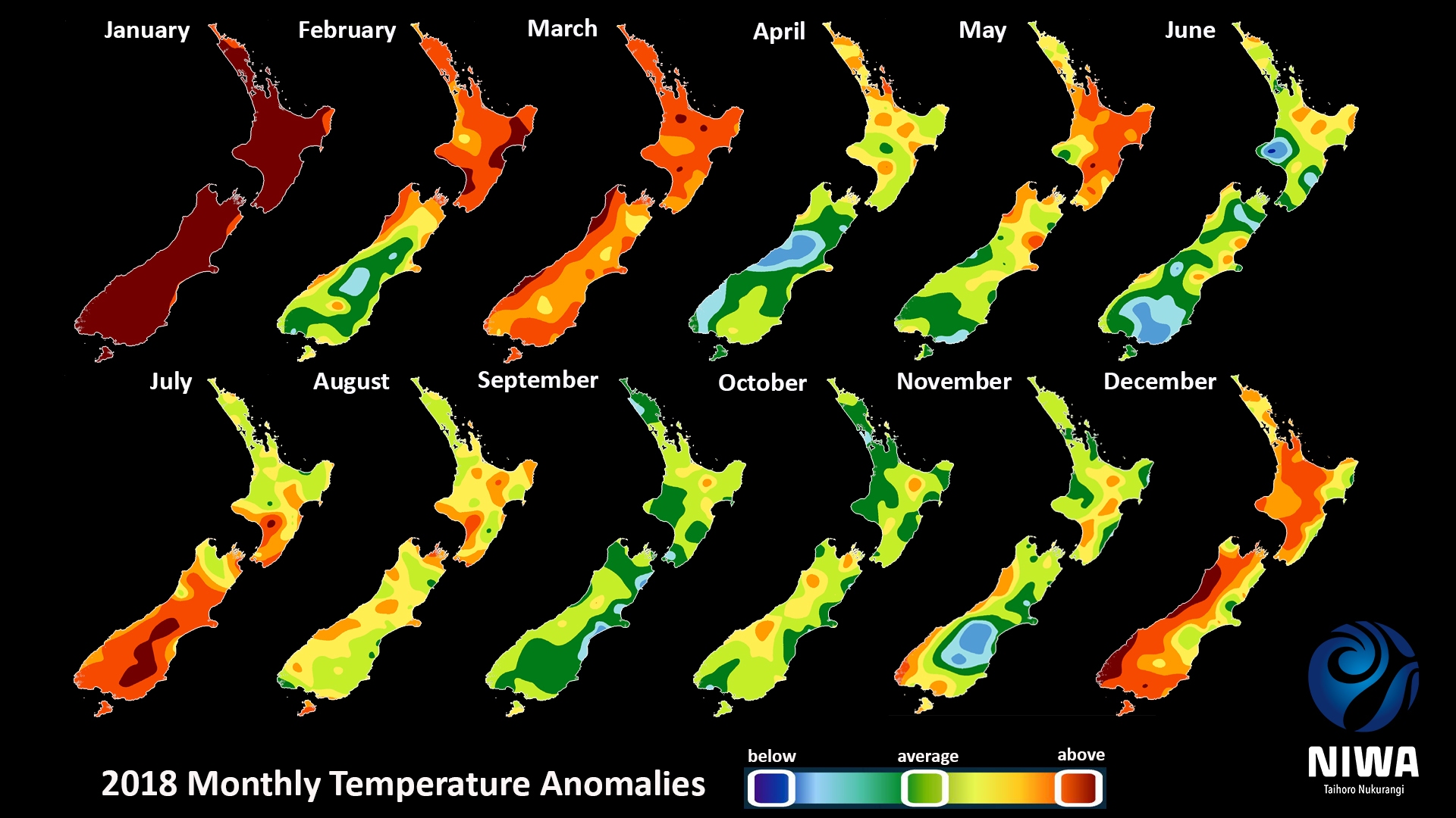 New Zealand temperature anomalies 2018 by month.