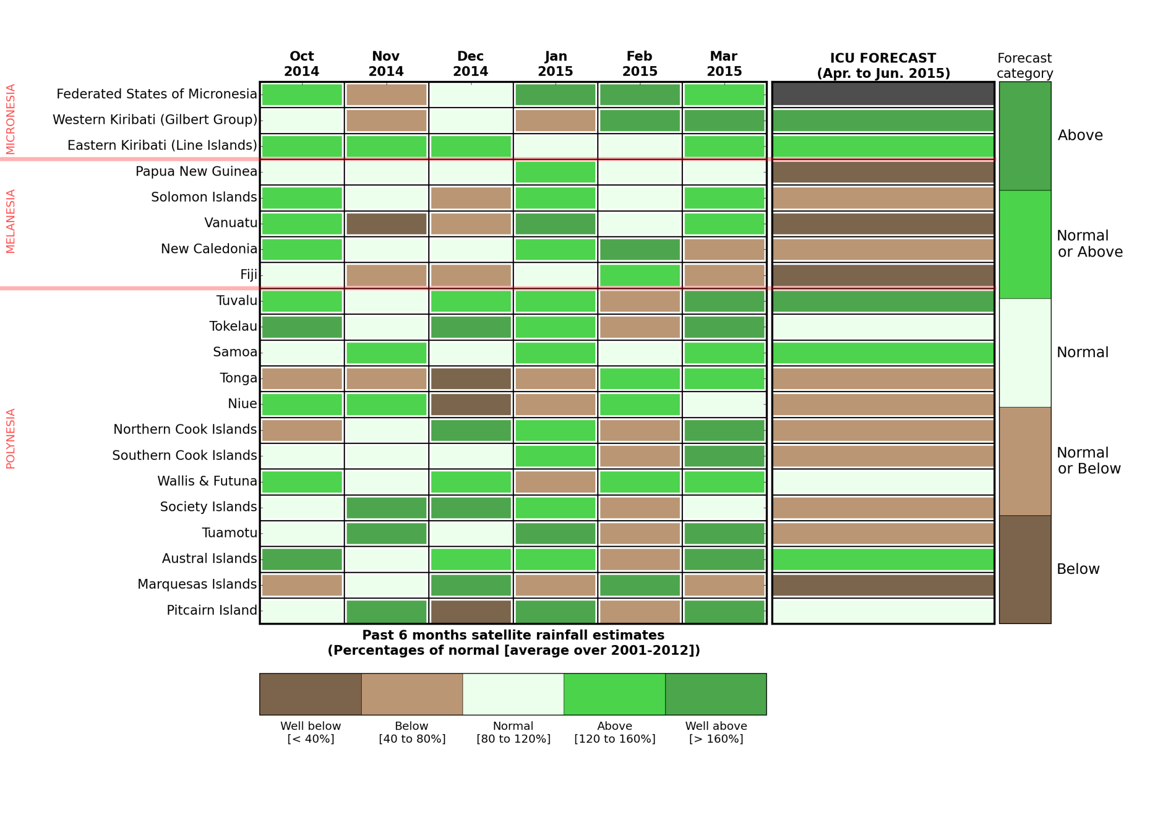 The last six months rainfall anomalies for each Island group alongside the latest ICU rainfall forecast for the April-June 2015 period.