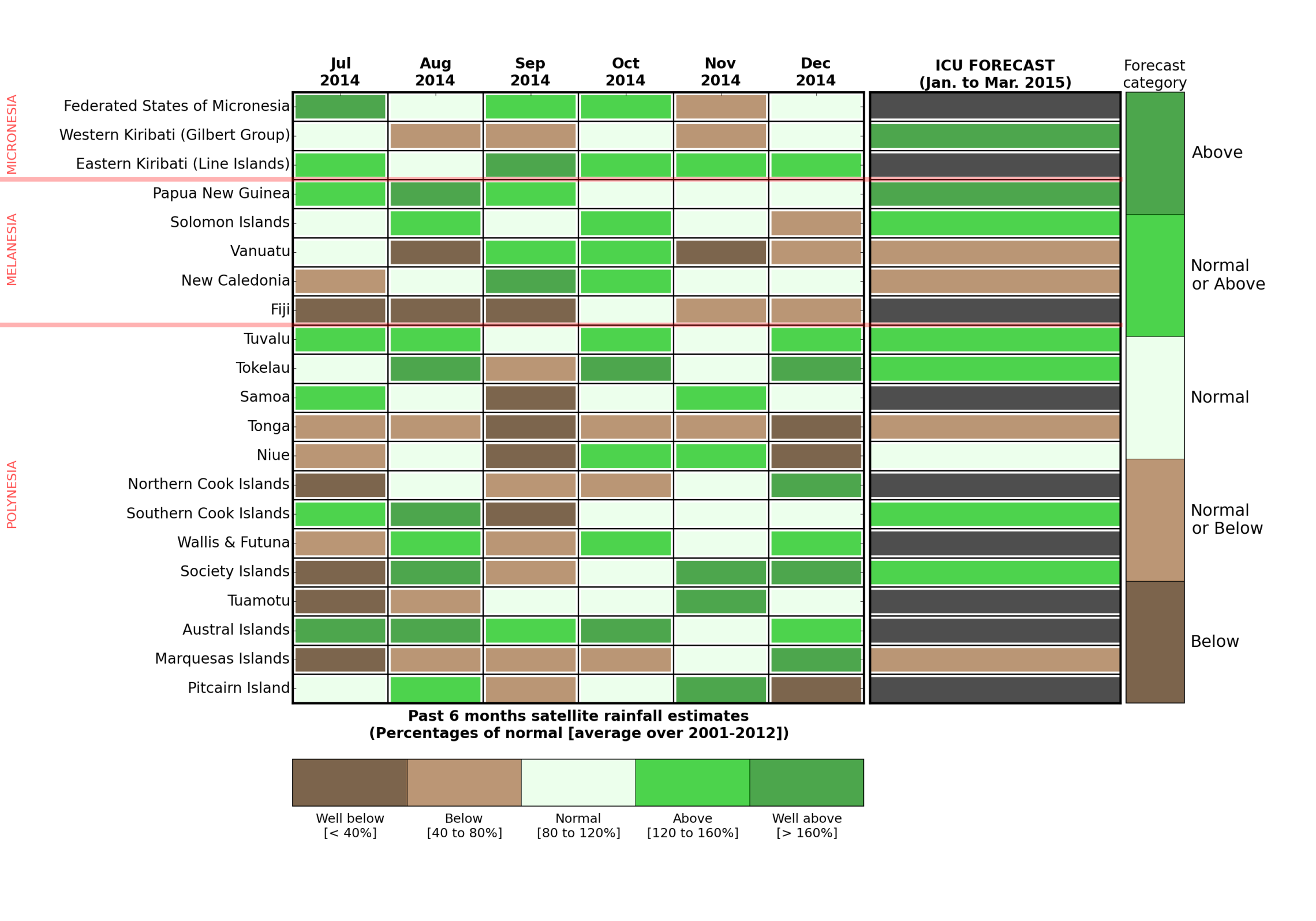 The last six months rainfall anomalies for each Island group alongside the latest ICU rainfall forecast for the January-March 2015 period.