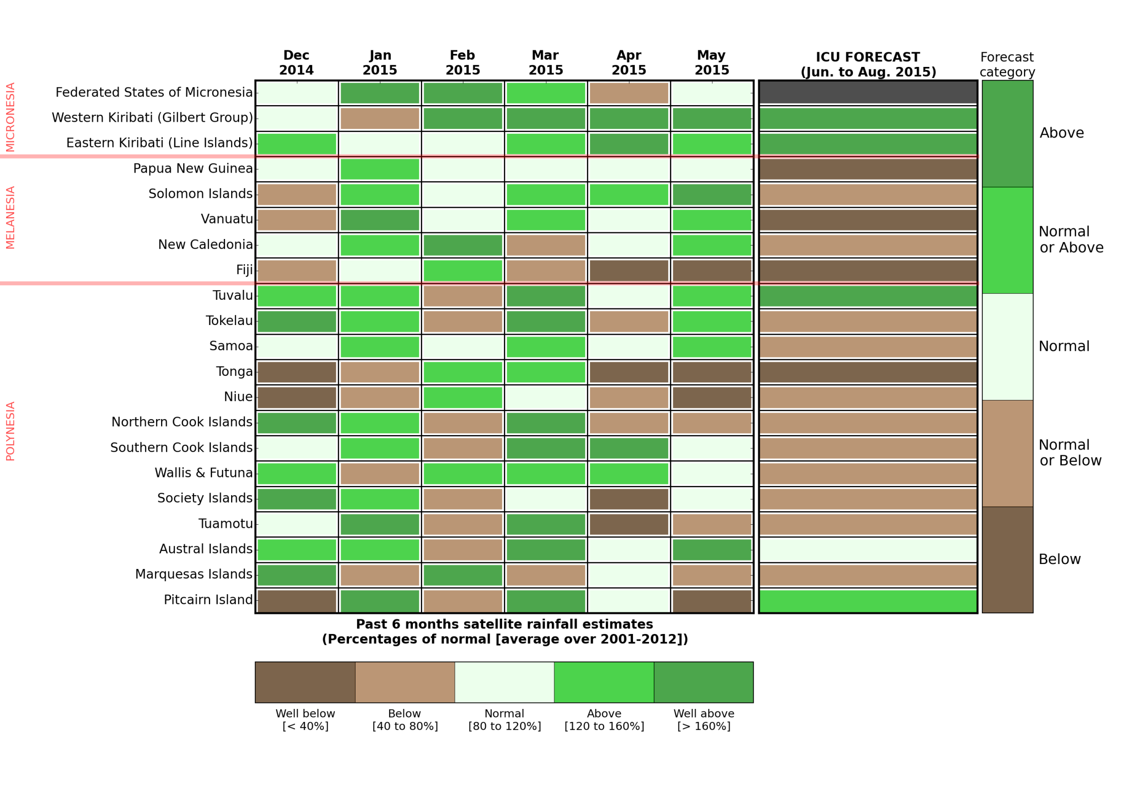 The last six months rainfall anomalies for each Island group alongside the latest ICU rainfall forecast for the June-August 2015 period.