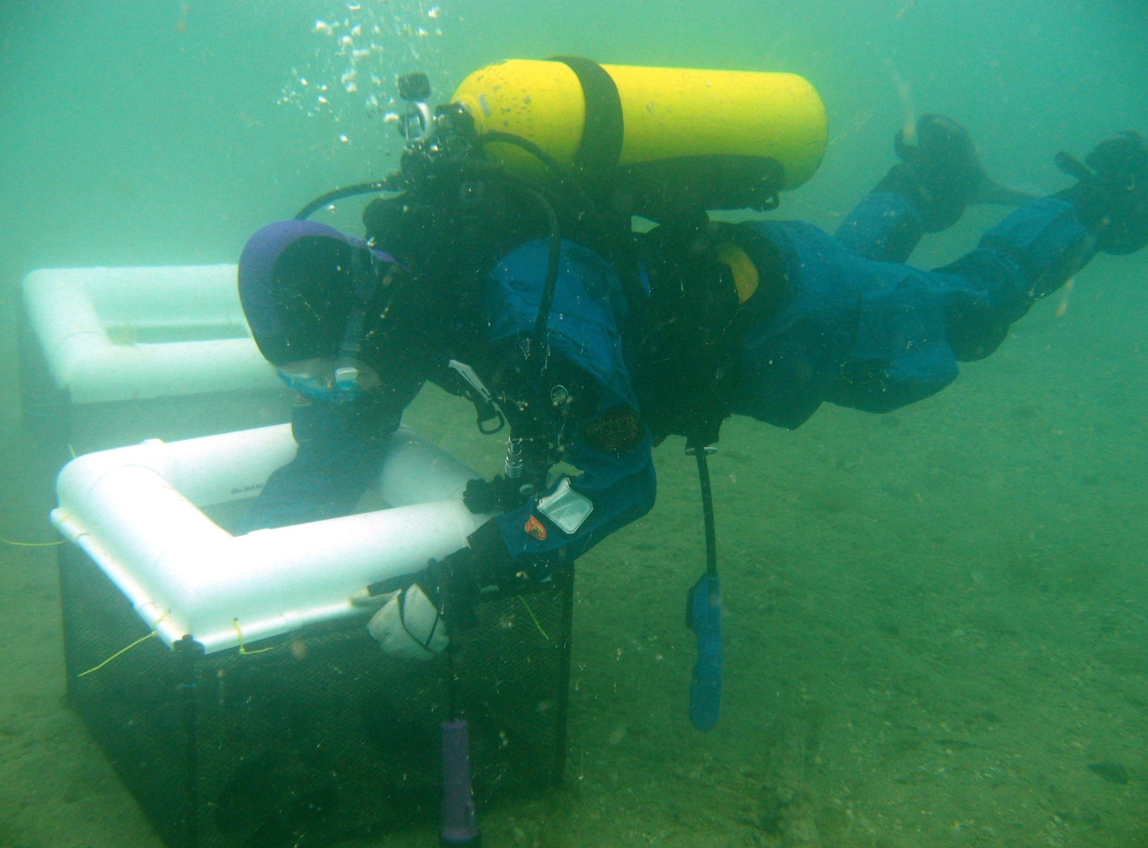Niki Davey diving over a sea cucumber enclosure below a mussel farm in the Marlborough Sounds.