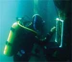 A NIWA diver scraping fouling organisms from pilings in the Port of Tauranga.