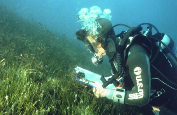 NIWA diver Mary de Winton studying a bed of Isoetes in Lake Wakatipu (photo: R. Wells)