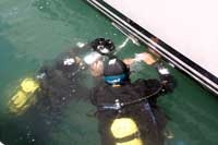 NIWA divers Crispin Middleton and Matt Smith inspect a yacht hull in an Auckland marina.