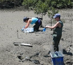 NIWA scientists Mr David Bremner and Dr Jacquie Reed taking core samples of sediments in the Rangitopuni Estuary, in the upper Waitemata Harbour.