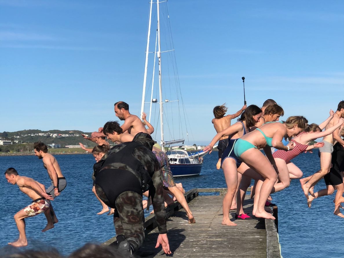 NIWA staff plunge into Evans Bay for their mid-winter's swim on 20 June 2019.