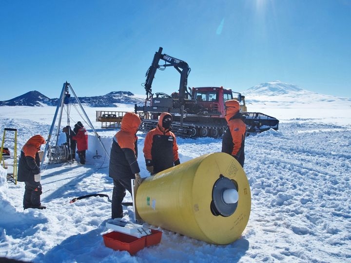 Ice Tethered Profiler being deployed in Antarctica by NIWA and Antarctica NZ staff. Mount Erebus in the background. (Craig Stewart, NIWA)