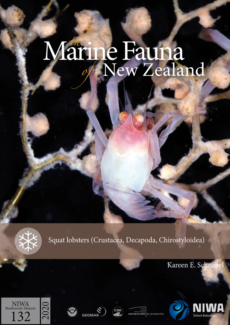 The front cover of the new NIWA Biodiversity Memoir features a close up image of Uroptychus bispinatus Baba, 1988 (NIWA 72233) on a specimen of Chrysogorgia coral. This beautiful squat lobster was collected from the south cone of Clark Seamount between 1456 m and 1460 m. Image credit: Rob Stewart, NIWA