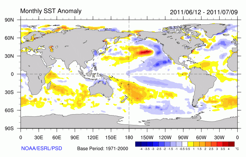 Differences from average global sea surface temperatures for December 2010. Map courtesy of NOAA Climate Diagnostics Centre (http://www.cdc.noaa.gov/map/images/sst/sst.anom.month.gif).