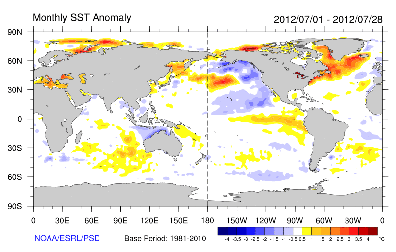 Differences from average global sea surface temperatures for 1st July to 28th July 2012. Map courtesy of NOAA Climate Diagnostics Centre (http://www.cdc.noaa.gov/map/images/sst/sst.anom.month.gif).