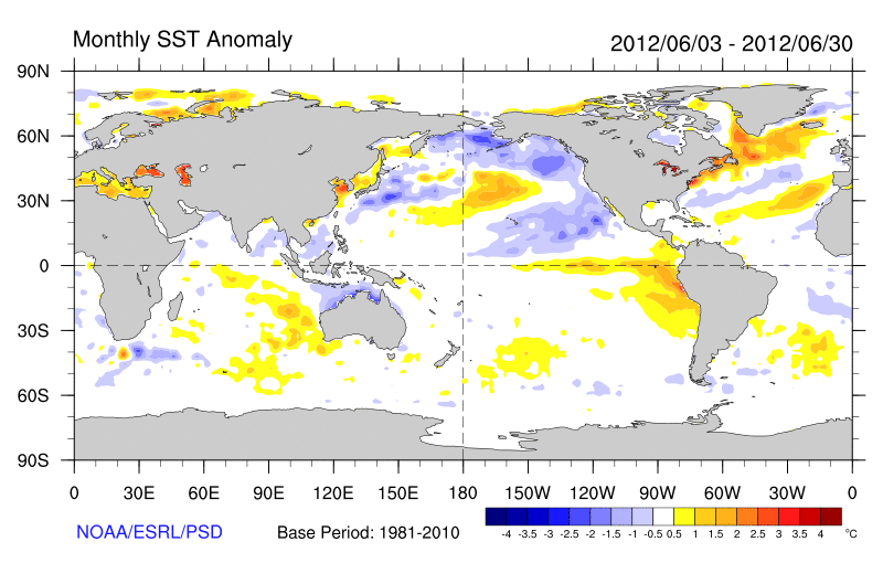Differences from average global sea surface temperatures for 3rd June to 30th June 2012. Map courtesy of NOAA Climate Diagnostics Centre (http://www.cdc.noaa.gov/map/images/sst/sst.anom.month.gif).