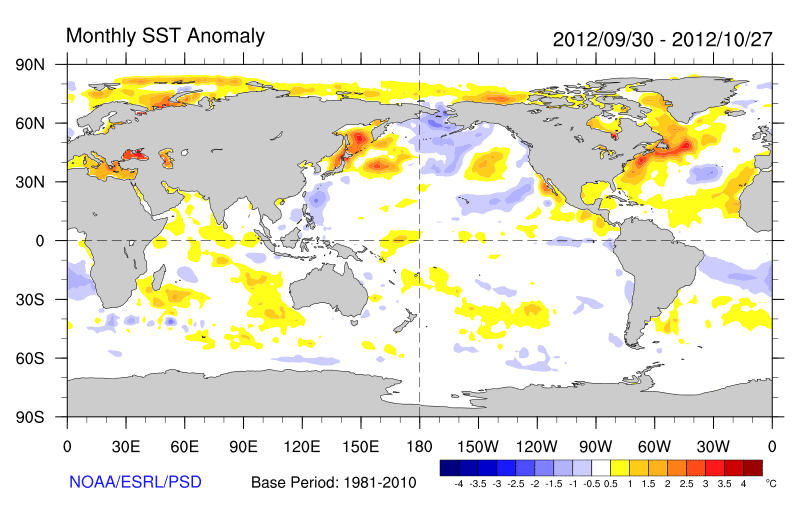 Differences from average global sea surface temperatures for 30th September to 27th October 2012. Map courtesy of NOAA Climate Diagnostics Centre (http://www.cdc.noaa.gov/map/images/sst/sst.anom.month.gif).