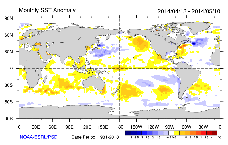 Differences from average global sea surface temperatures for 13th of April 2014 to 10th of May 2014. Map courtesy of NOAA Climate Diagnostics Centre (http://www.cdc.noaa.gov/map/images/sst/sst.anom.month.gif).