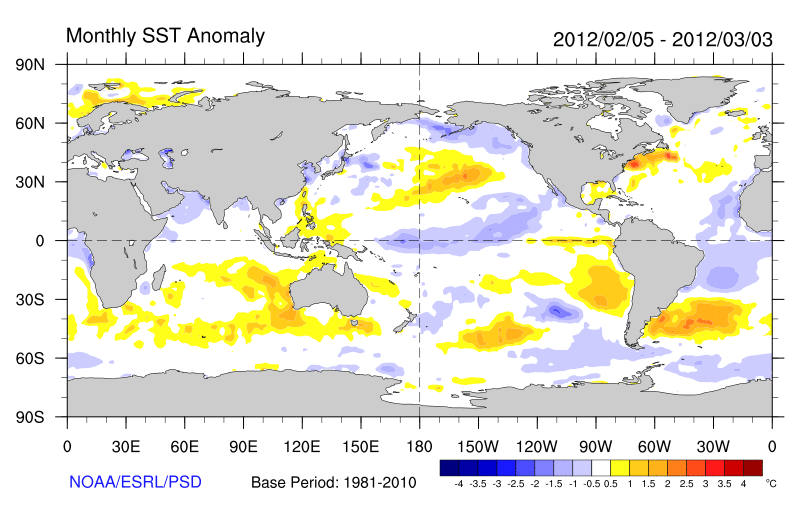 Differences from average global sea surface temperatures for 5th February to 3rd March 2012. Map courtesy of NOAA Climate Diagnostics Centre (http://www.cdc.noaa.gov/map/images/sst/sst.anom.month.gif).