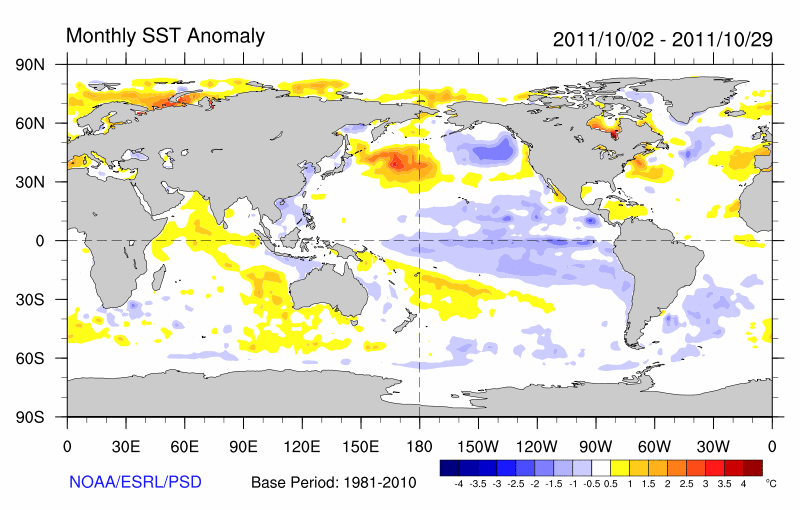 Differences from average global sea surface temperatures for 2nd October 2011 to 29th October 2011. Map courtesy of NOAA Climate Diagnostics Centre (http://www.cdc.noaa.gov/map/images/sst/sst.anom.month.gif).