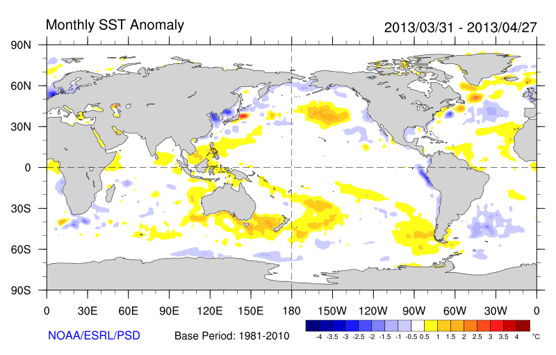 Differences from average global sea surface temperatures for 31st of March to 27th of April 2013. Map courtesy of NOAA Climate Diagnostics Centre (http://www.cdc.noaa.gov/map/images/sst/sst.anom.month.gif).