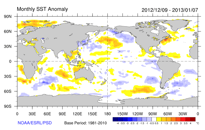 Differences from average global sea surface temperatures for 9th December 2012 to 7th January 2013. Map courtesy of NOAA Climate Diagnostics Centre (http://www.cdc.noaa.gov/map/images/sst/sst.anom.month.gif).