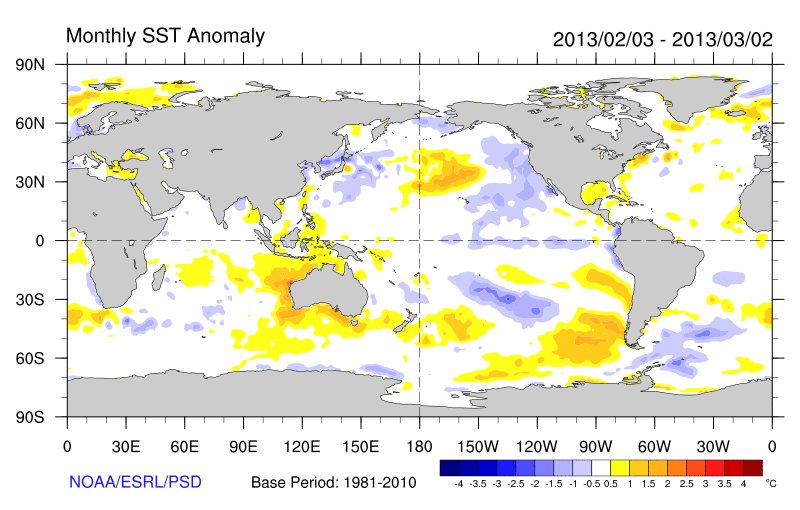 Differences from average global sea surface temperatures for 3rd of February to 2nd of March 2013. Map courtesy of NOAA Climate Diagnostics Centre (http://www.cdc.noaa.gov/map/images/sst/sst.anom.month.gif).