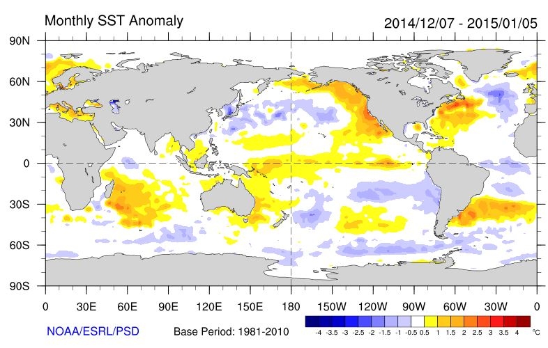 Differences from average global sea surface temperatures for 7 December 2014 to 5 January 2015. Map courtesy of NOAA Climate Diagnostics Centre (http://www.cdc.noaa.gov/map/images/sst/sst.anom.month.gif).