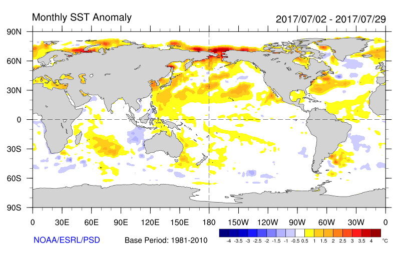 Differences from average global sea surface temperatures for 2 July - 29 July 2017. Map courtesy of NOAA Climate Diagnostics Centre (https://www.esrl.noaa.gov/psd/map/images/sst/sst.anom.month.gif)