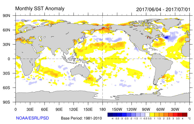 Differences from average global sea surface temperatures for 4 June - 1 July 2017. Map courtesy of NOAA Climate Diagnostics Centre (https://www.esrl.noaa.gov/psd/map/images/sst/sst.anom.month.gif)