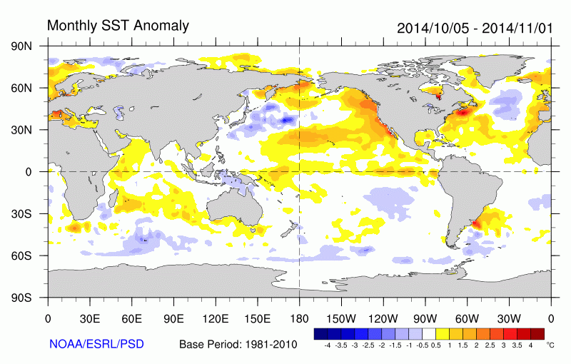 Differences from average global sea surface temperatures for 5 October 2014 to 1 November 2014. Map courtesy of NOAA Climate Diagnostics Centre (http://www.cdc.noaa.gov/map/images/sst/sst.anom.month.gif).