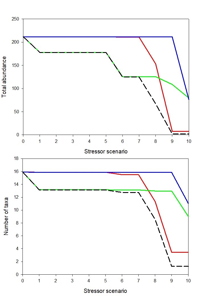 Figure 2: Non-linear ecosystem responses to increasing stressor scenarios when three known stressors occur individually and in combination.