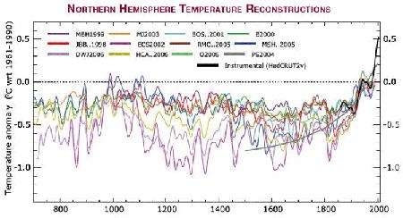 Records of Northern Hemisphere temperature variation during the last 1300 years with 12 reconstructions using multiple climate proxy records shown in colour and instrumental records shown in black (Figure from Forster et al., 2007).