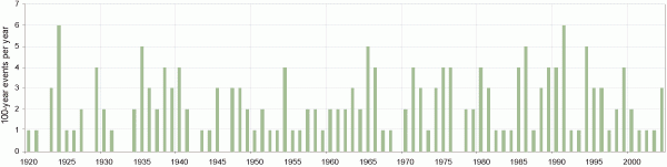 The number of New Zealand 1-day (9am-9am) 100-year rainfall events from 1920 to 2004. Note that the same event might be recorded at more than one station.