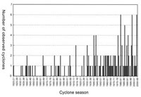 Number of observed cyclones per season 1820–2006, Cook Islands.