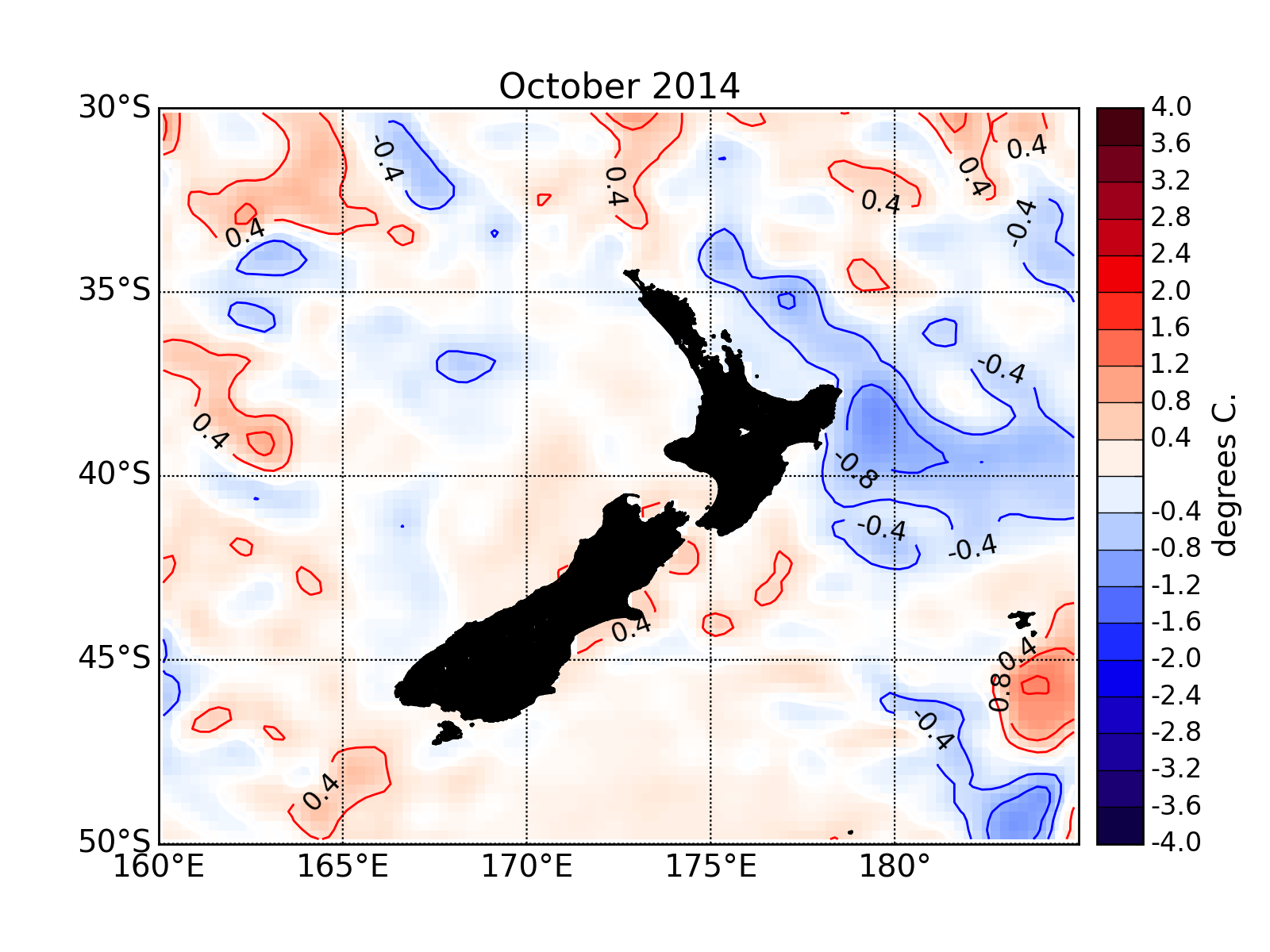 Differences from normal October surface temperatures in the seas around New Zealand.