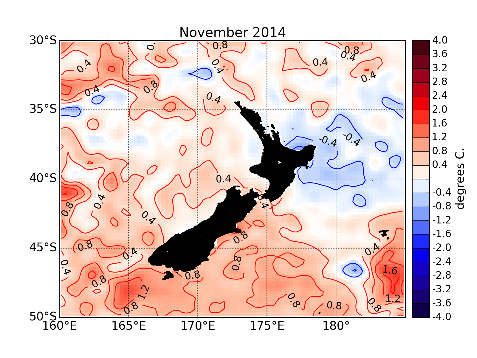 Differences from normal November surface temperatures in the seas around New Zealand.