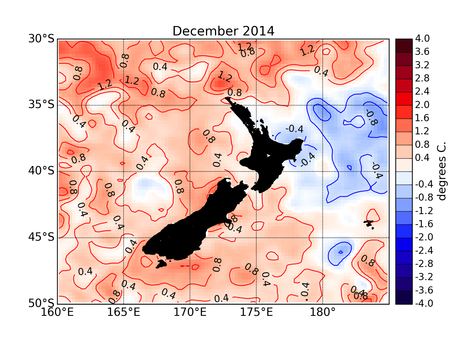 Differences from normal December surface temperatures in the seas around New Zealand.