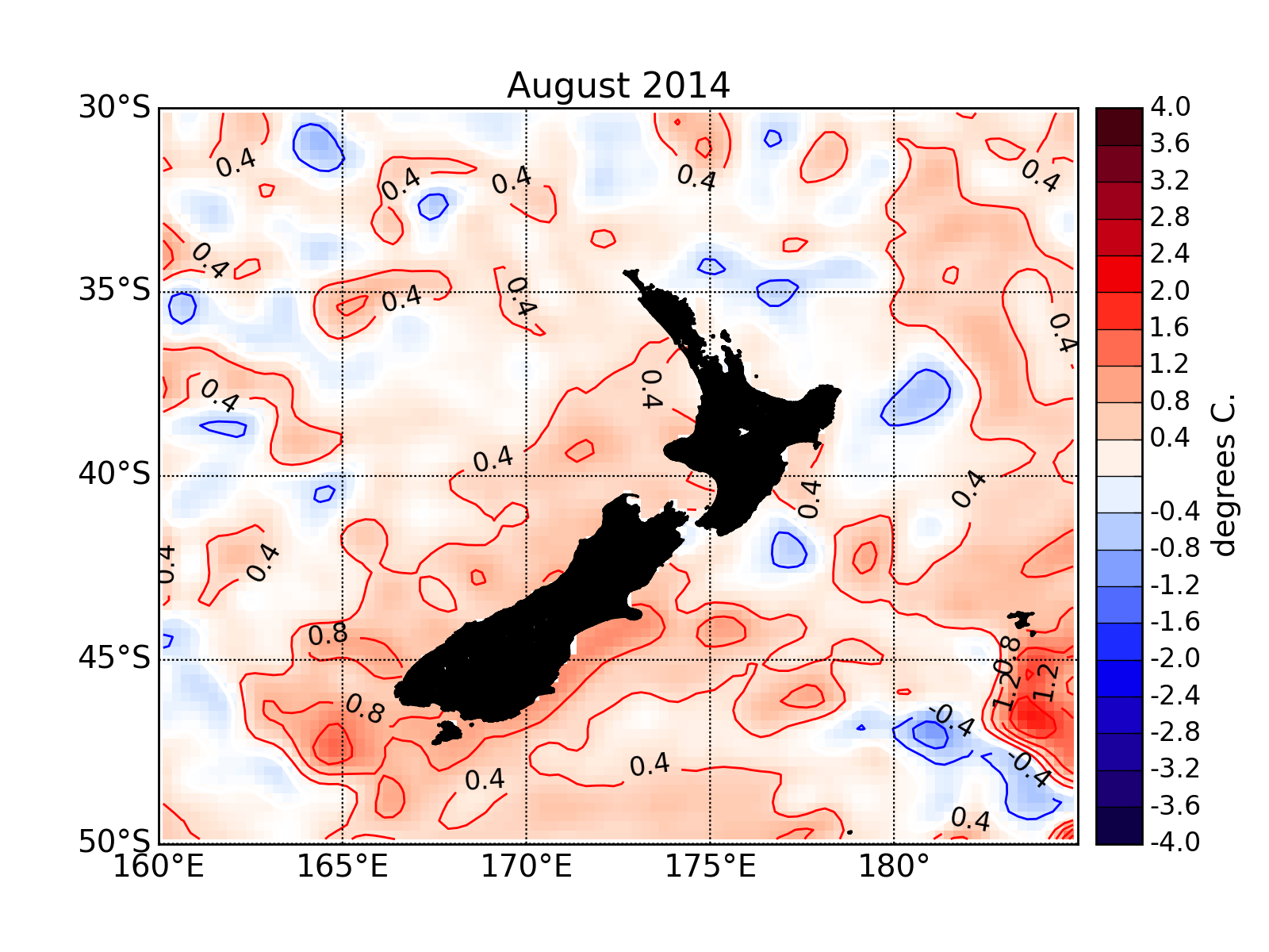 Differences from normal August surface temperatures in the seas around New Zealand.