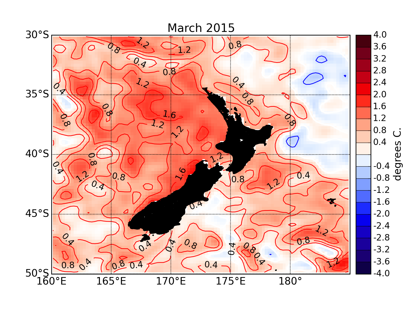 Differences from normal March surface temperatures in the seas around New Zealand.
