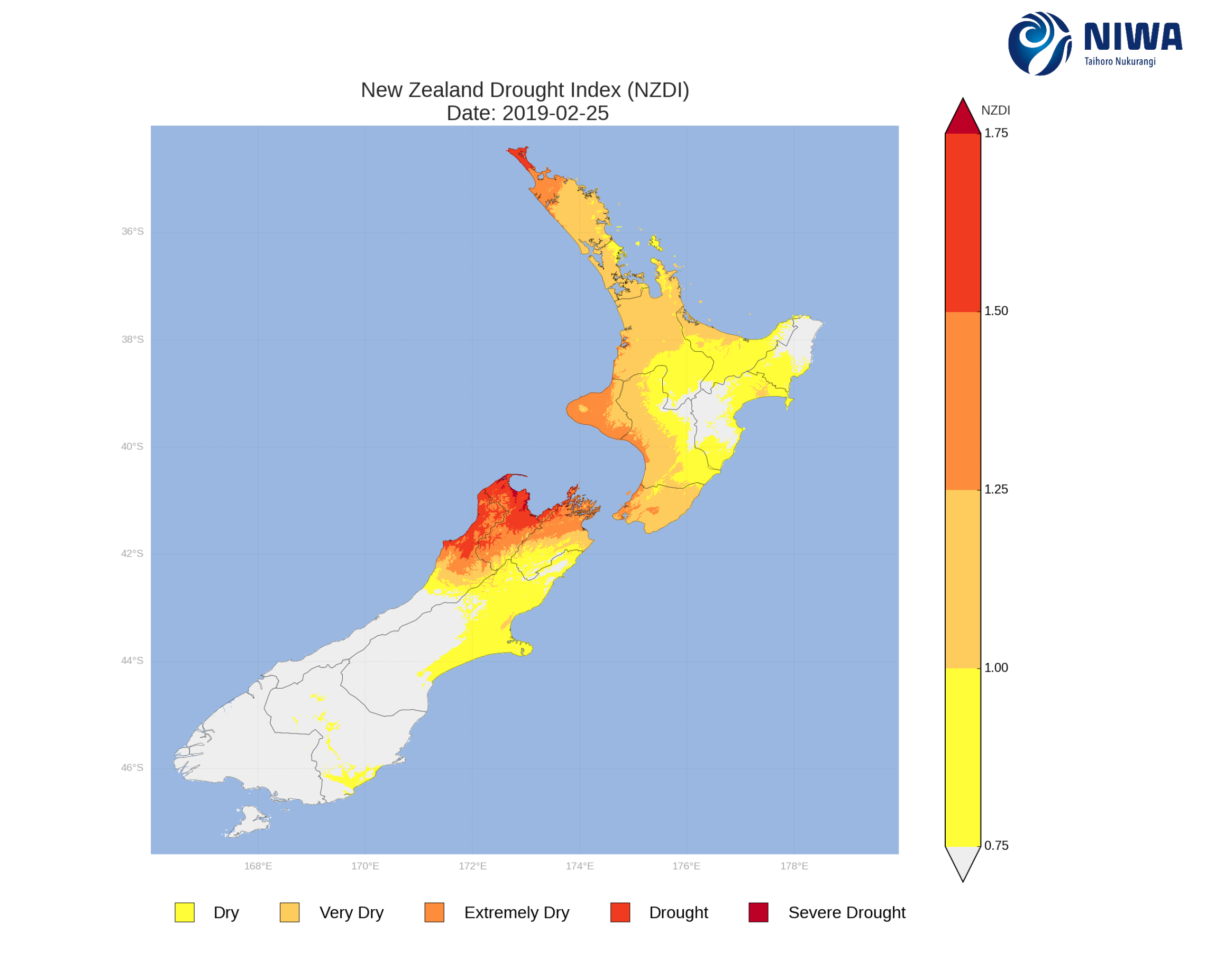 As of 25 February, the New Zealand Drought Index (NZDI) map below shows that meteorological drought conditions are now in place across parts of the Far North, Tasman, Nelson, Buller and Marlborough along with widespread dry to extremely dry conditions. Please note: some hotspots in the text above may not correspond with the NZDI map, mainly because the NZDI uses additional dryness indices including one which integrates the rainfall deficit over the past 60 days. Changes are therefore slower to appear in the NZDI compared to the instantaneous status maps of soil moisture anomaly.