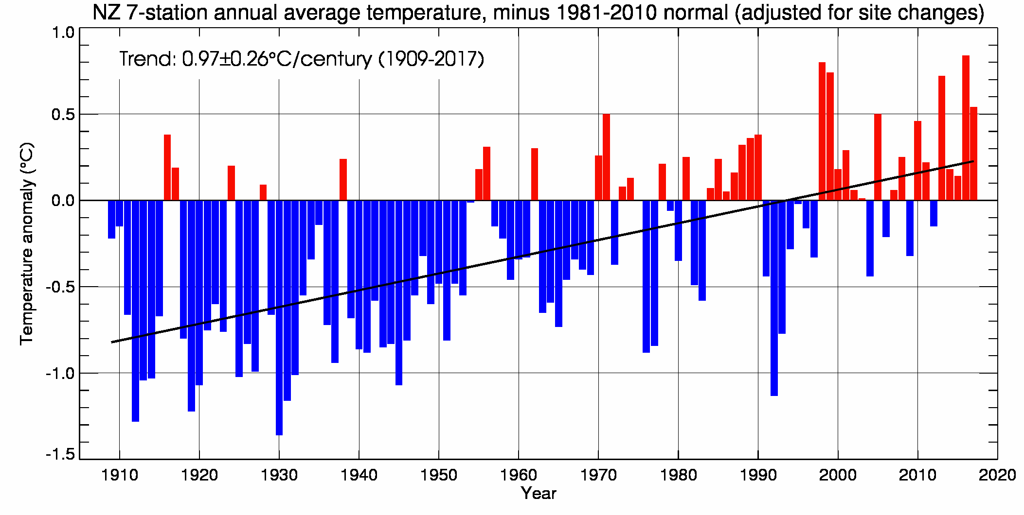 Mean annual temperature for New Zealand, calculated from NIWA's 'seven-station' series. This series uses climate data from seven geographically representative locations. The data are adjusted to take account of factors such as different measurement sites (Mullan et al 2010). The blue and red bars show the difference from the 1981-2010 average. The black line is the linear trend over 1909 to 2017 (0.97 ± 0.26°C/100 years).
